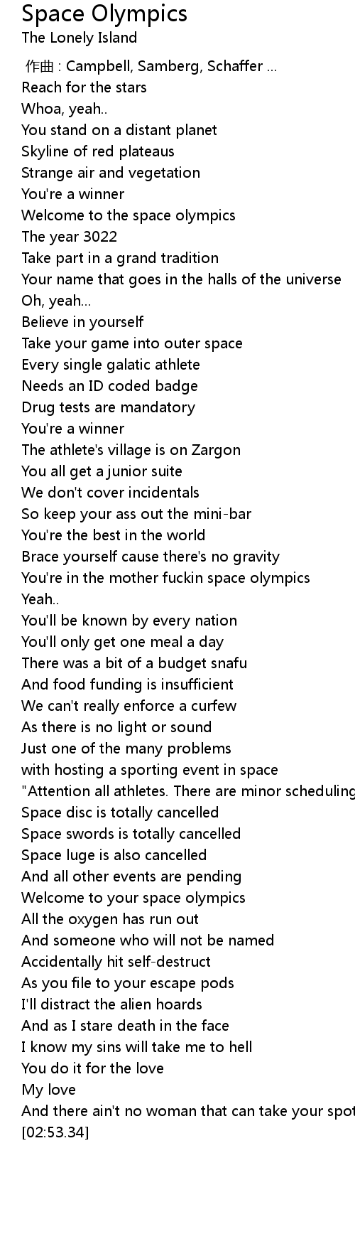 | [00:34.72] | Welcome to the space olympics |