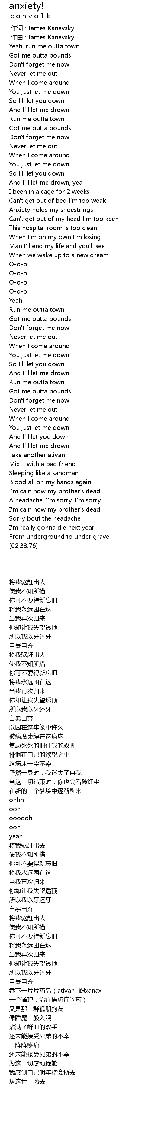 | [02:13.37] | 吞下一片片药品(ativan -跟xanax 一个道理,治疗焦虑症的药) |