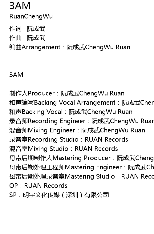 | 母带后期处理工程师Mastering Engineer:阮成武ChengWu Ruan | |