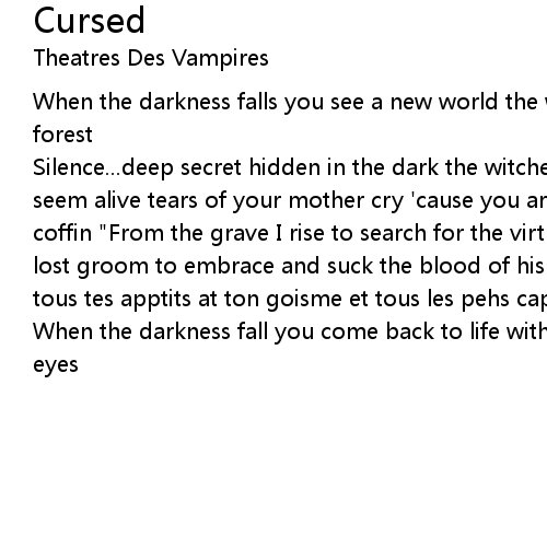 | Silence...deep secret hidden in the dark the witches and their spells the trees seem alive tears of your mother cry 'cause you are dead entombed in a dismal coffin "From the grave I rise to search for the virtue, that I miss, of love my lost groom to embrace and suck the blood of his heart..." "Gange la mort avec tous tes apptits at ton goisme et tous les pehs capitaux" | |