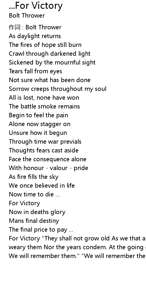 | For Victory " They shall not grow old As we that are left grow old Age shall not weary them Nor the years condem. At the going down of the sun And in the morning We will remember them." " We will remember them" |