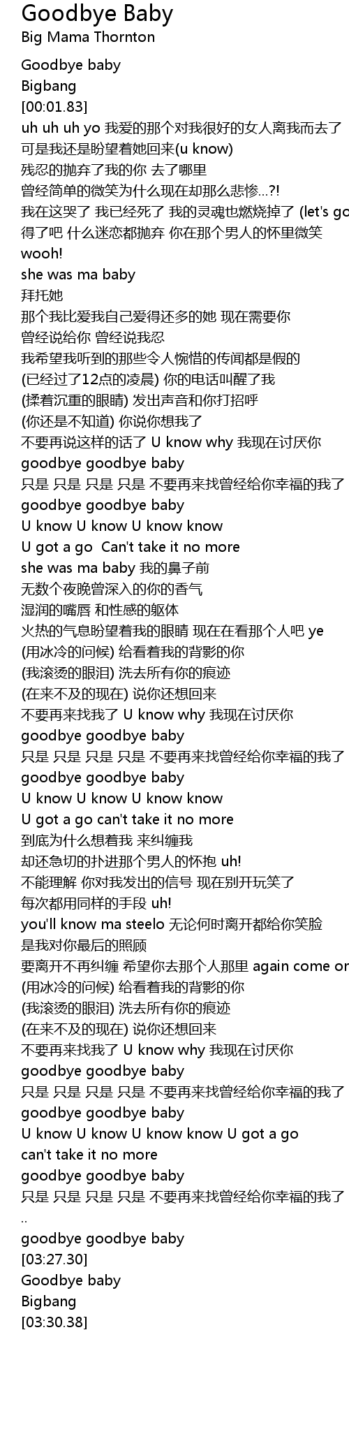 | [00:12.54] | wǒ zài zhè kū le wǒ yǐ jīng sǐ le wǒ de líng hún yě rán shāo diào le let' s go |
