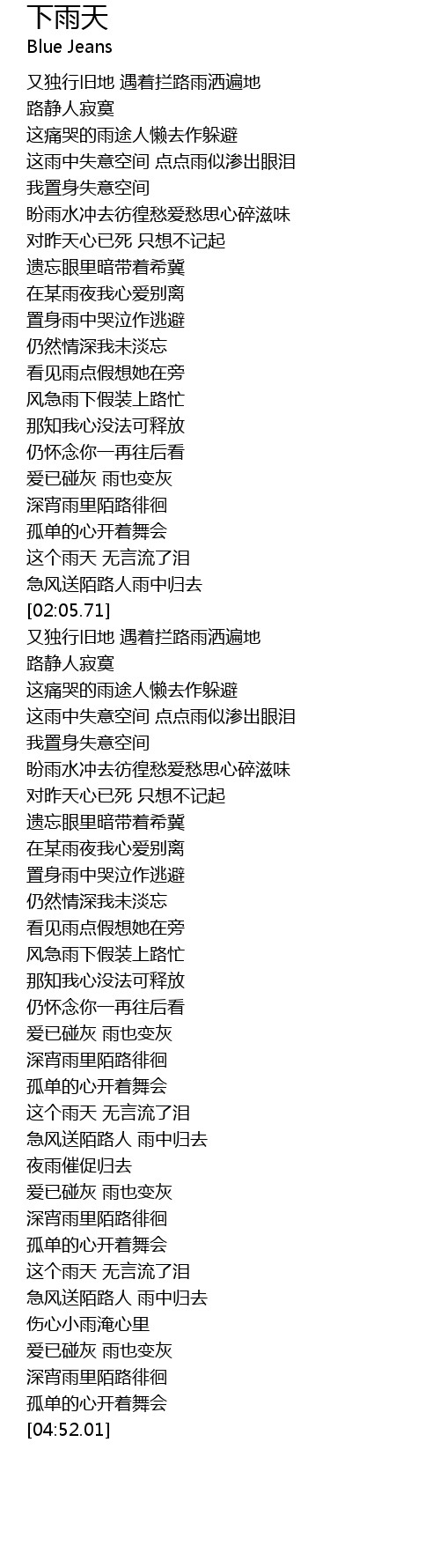 | [00:23.26] | 又独行旧地 遇着拦路雨洒遍地 |