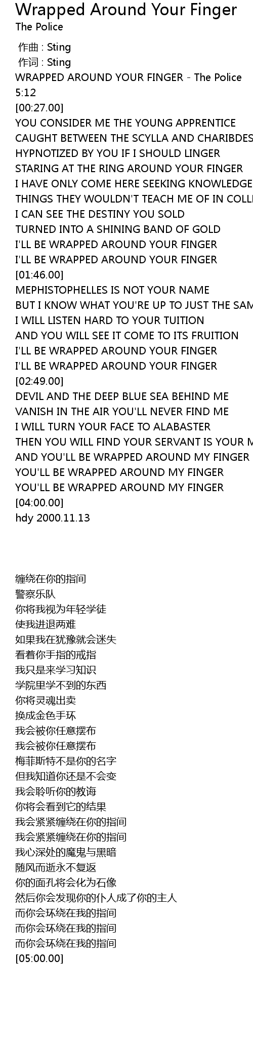 | [00:00.00] | WRAPPED AROUND YOUR FINGER - The Police |