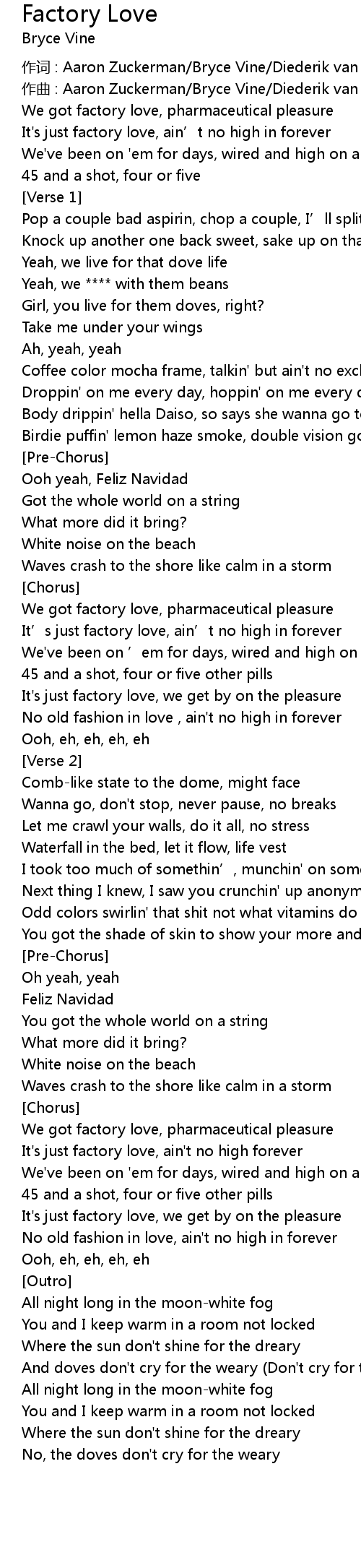 | It's just factory love, we get by on the pleasure | |