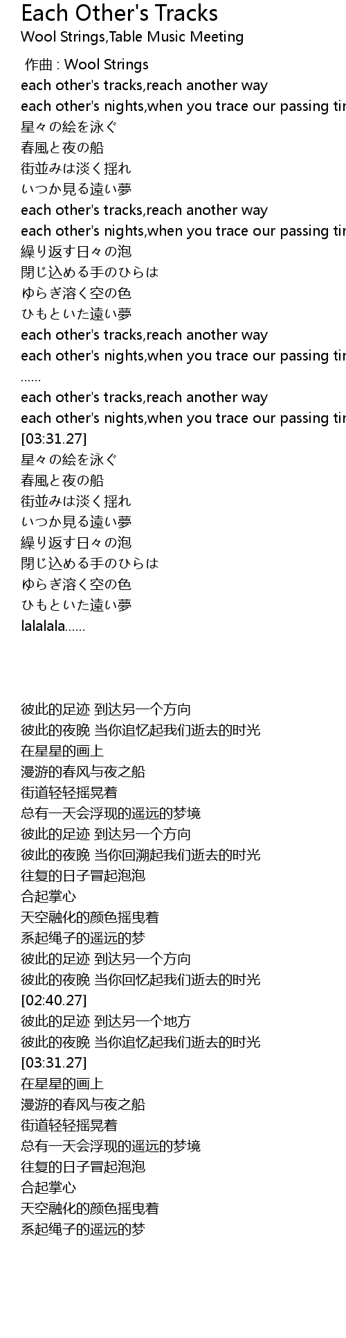 | [03:06.76] | each other' s tracks, reach another way |