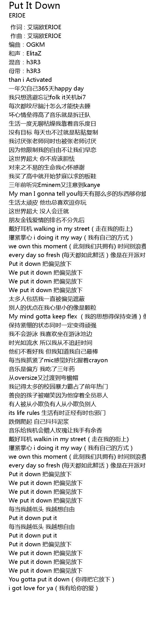 | [02:55.388] | You gotta put it down nǐ dé bǎ tā fàng xià |