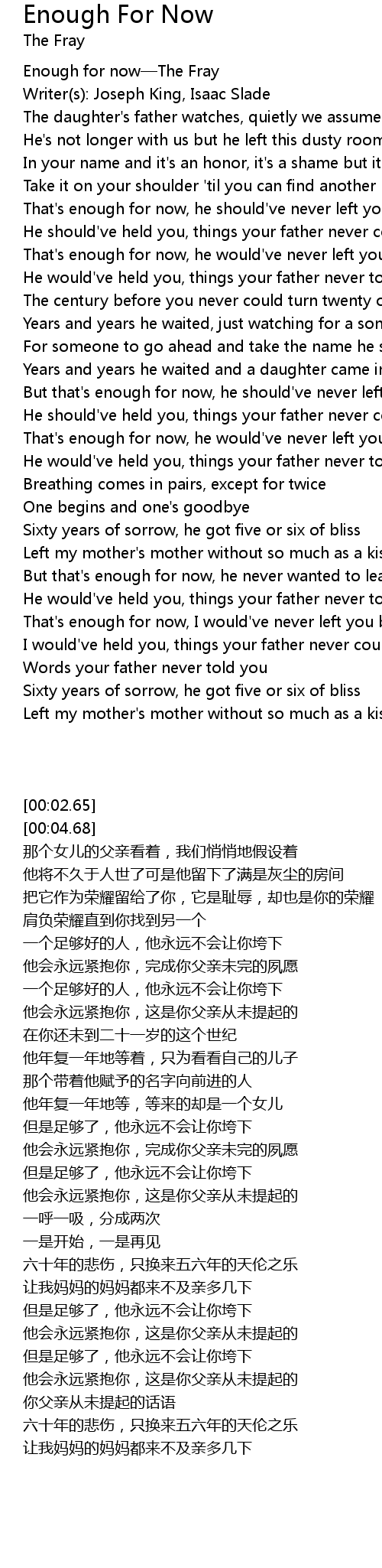 | [00:35.58] | That's enough for now, he should've never left you broken |