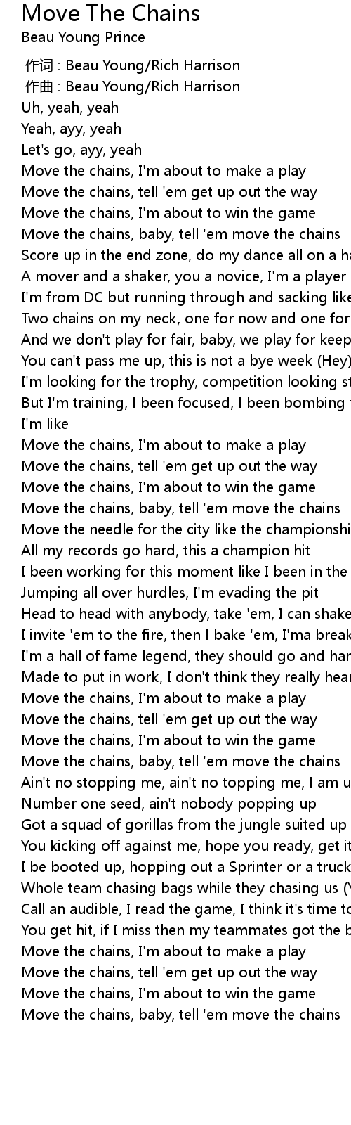 | [00:25.17] | Move the chains, baby, tell 'em move the chains |