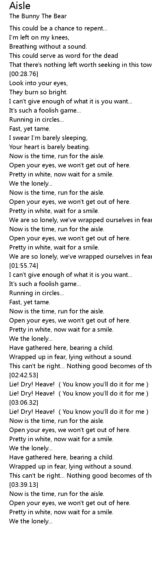 | [03:53.64] | Now is the time, run for the aisle. |