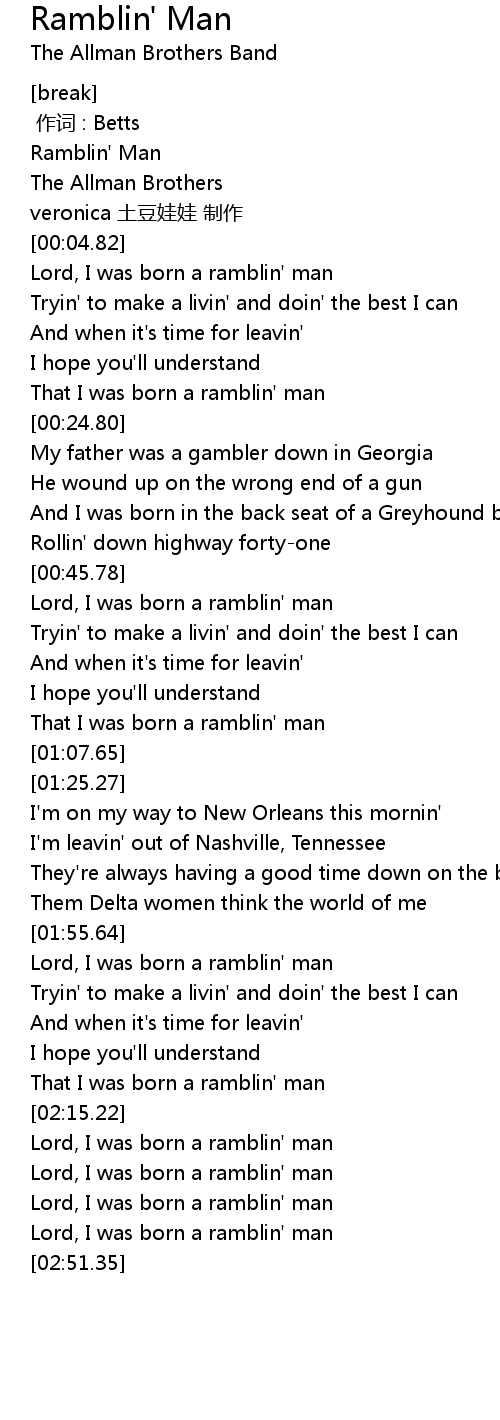 | [00:06.34] | Lord, I was born a ramblin' man |
