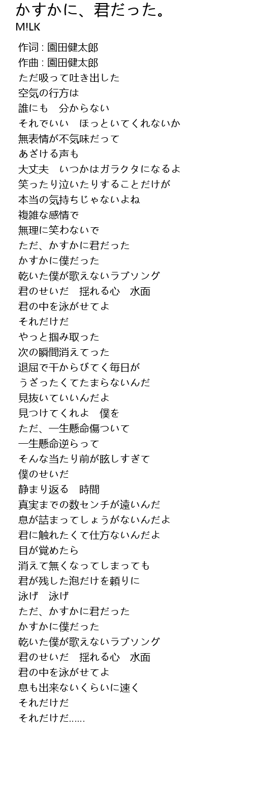 | [03:00.089] | 君のせいだ 揺れる心 水面 |
