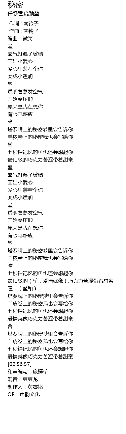 | [02:04.28] | 最顶级的(堃:爱情就像)巧克力苦涩带着甜蜜 |