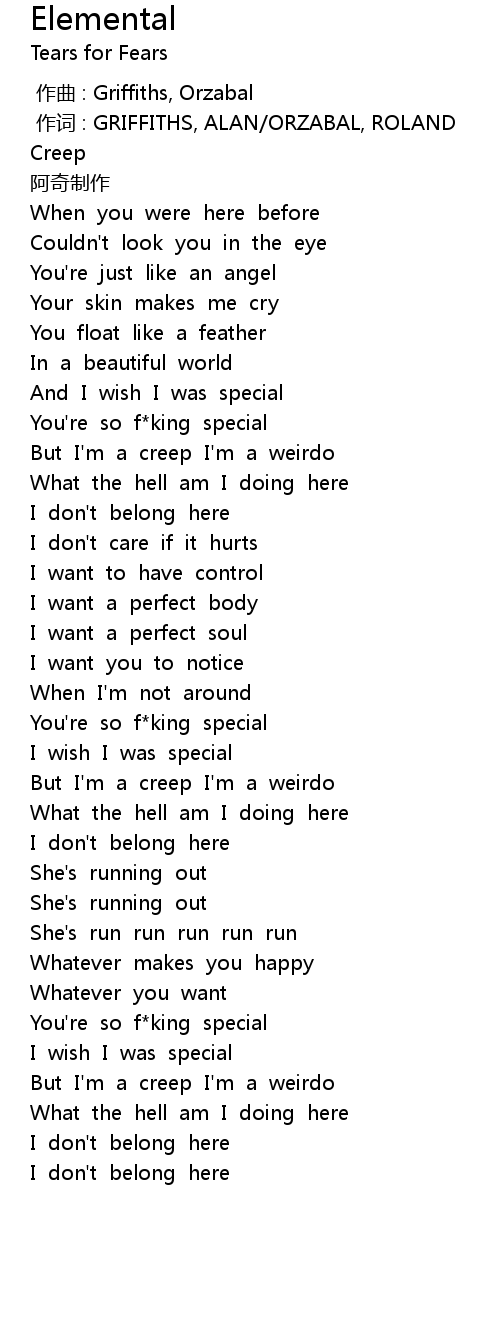 | [01:12.464] | But I' m a creep I' m a weirdo |