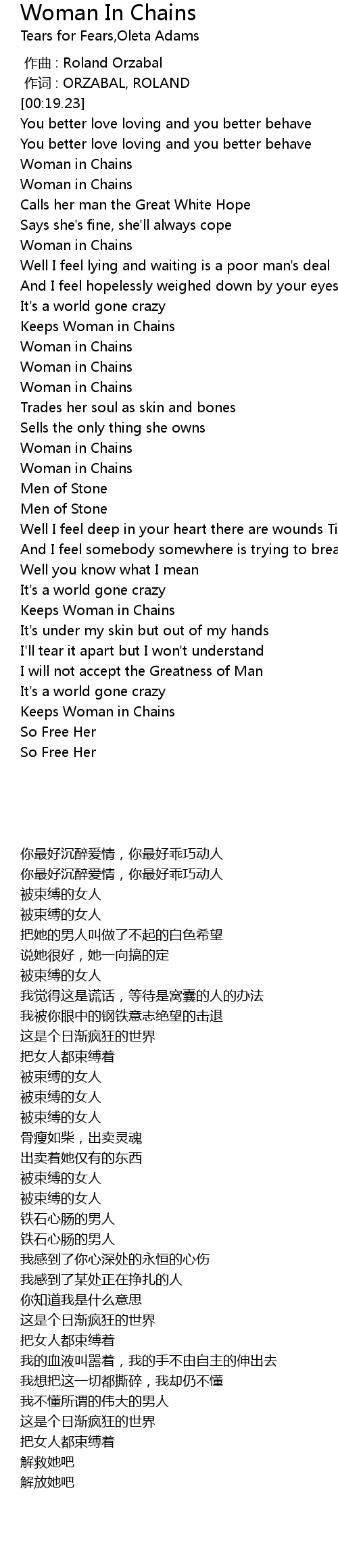 | [02:30.38] | Woman in Chains |