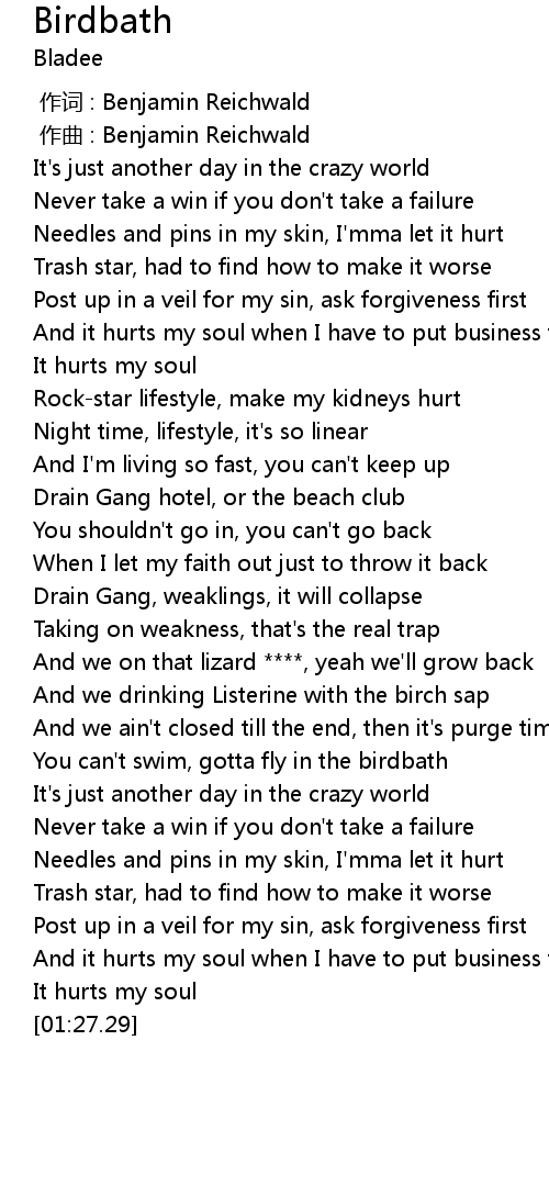 | [01:02.91] | You can't swim, gotta fly in the birdbath |