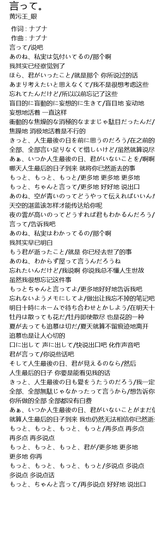 | [03:06.93] | 口に出して 声に出して/快说出口吧 化作声音吧 |