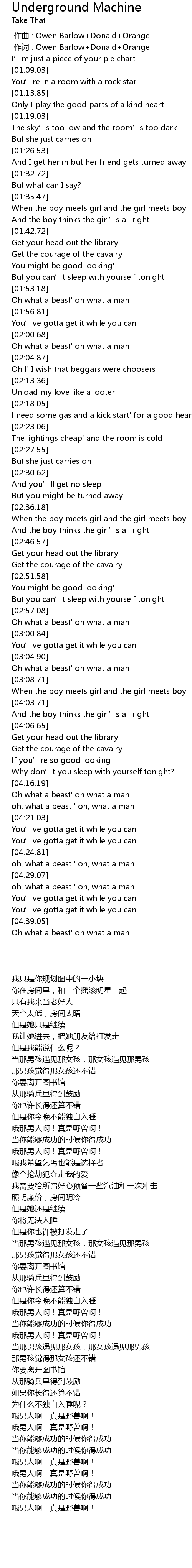 | [00:01.00] | zuò cí : Owen Barlow Donald Orange |