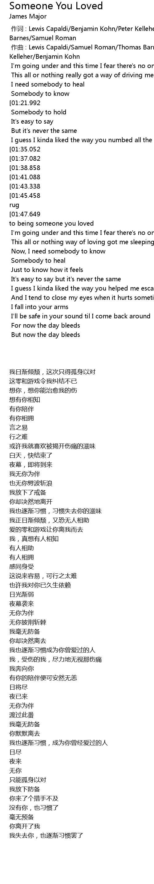 | [00:01.000] | zuo qu : Lewis Capaldi Samuel Roman Thomas Barnes Peter Kelleher Benjamin Kohn |
