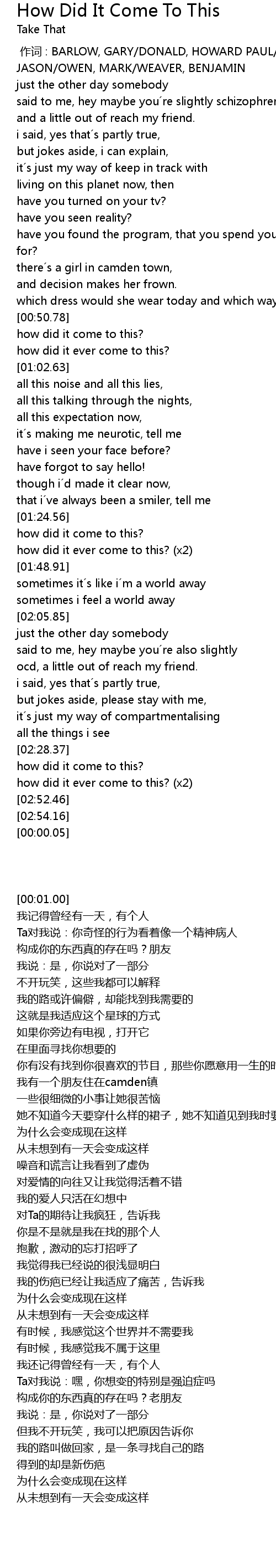 | [00:19.30] | Ta对我说:你奇怪的行为看着像一个精神病人 |