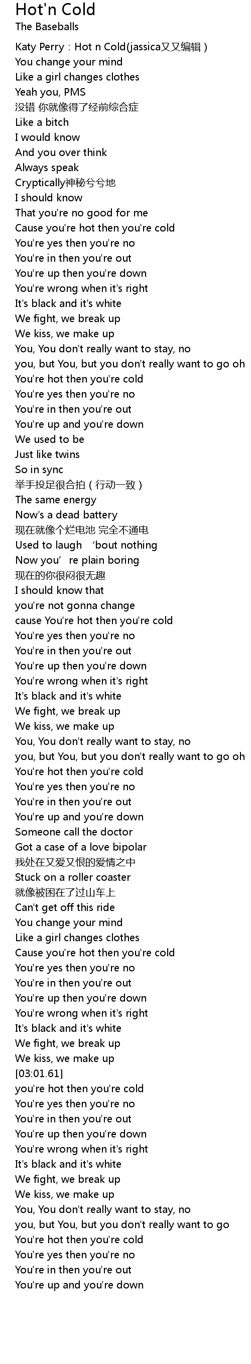 | [03:24.00] | You' re hot then you' re cold |