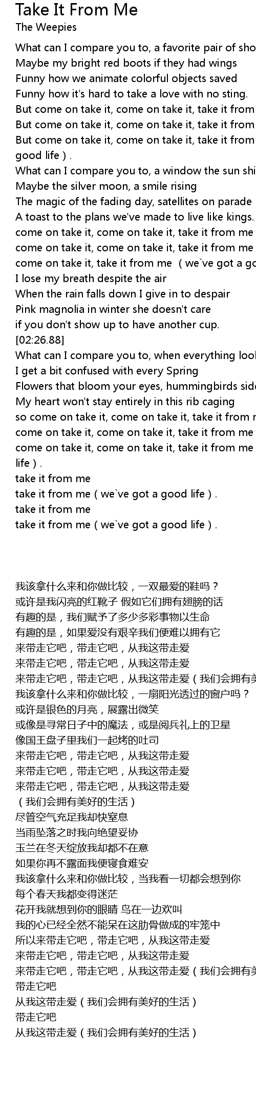 | [03:05.51] | come on take it, come on take it, take it from me(we`ve got a good life). |