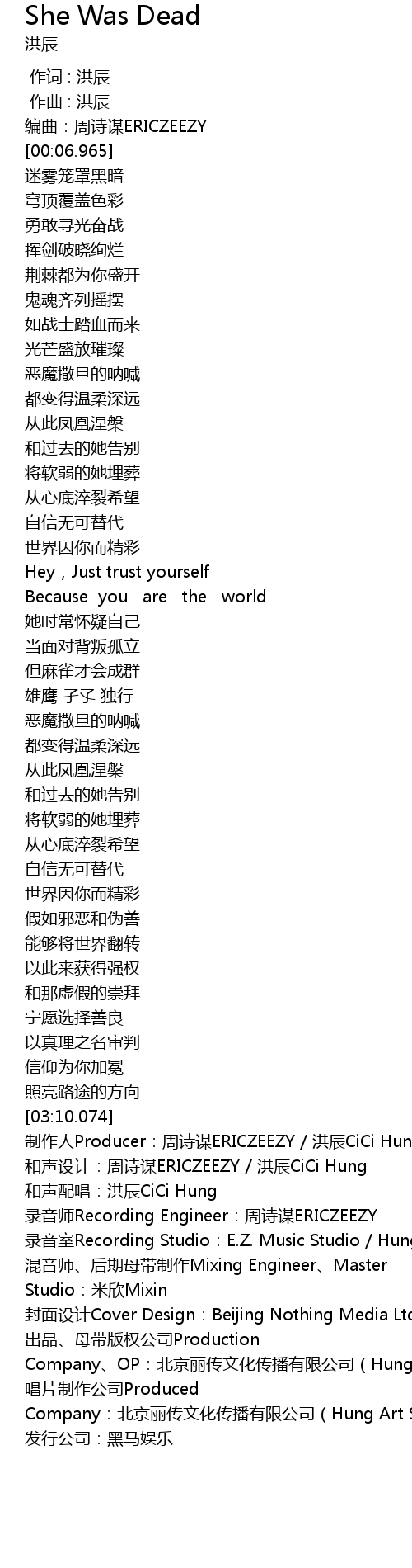 | [03:13.341] | 和声配唱:洪辰CiCi Hung |
