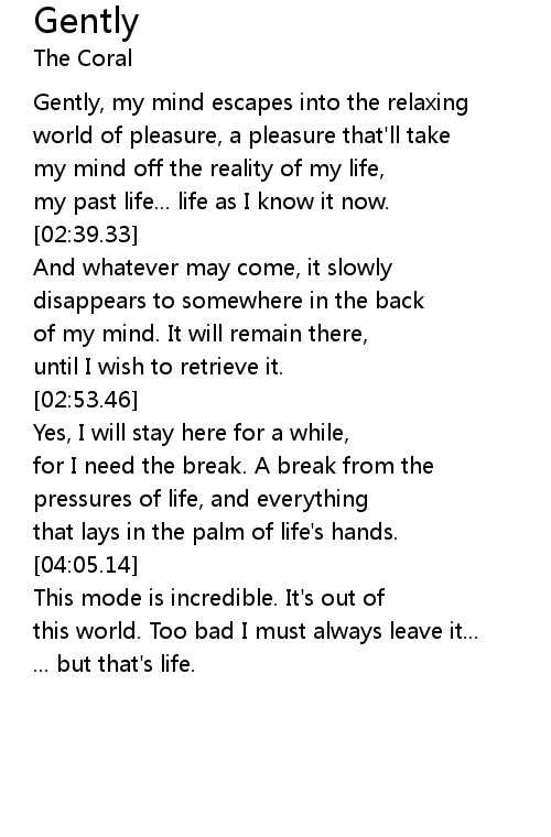 | [02:18.35] | Gently, my mind escapes into the relaxing |