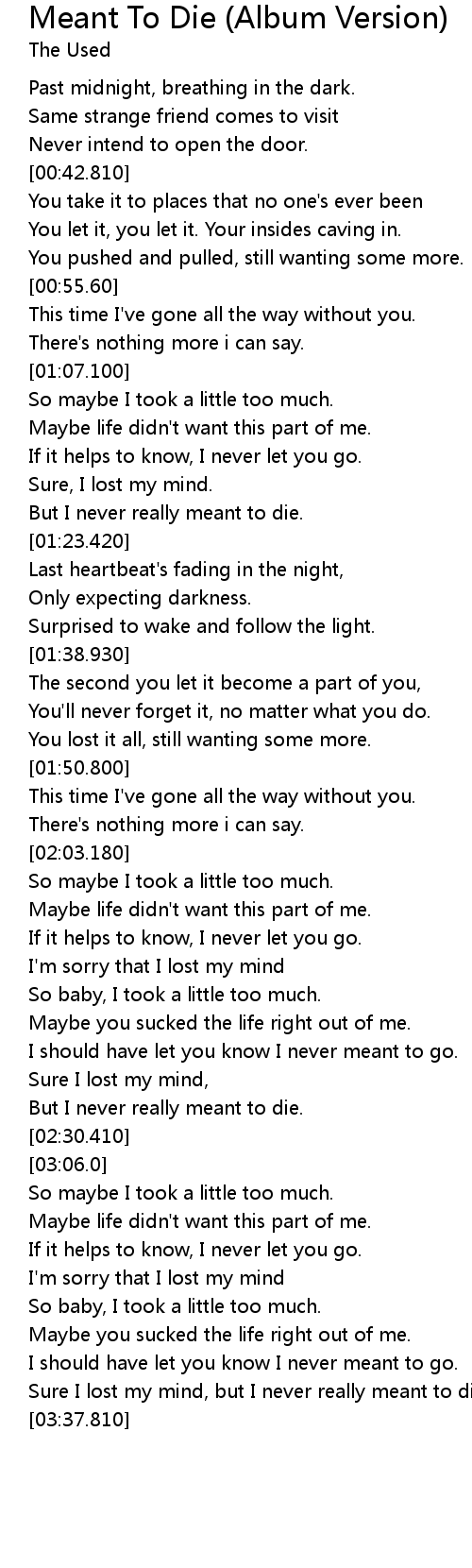 | [03:32.810] | Sure I lost my mind, but I never really meant to die. |