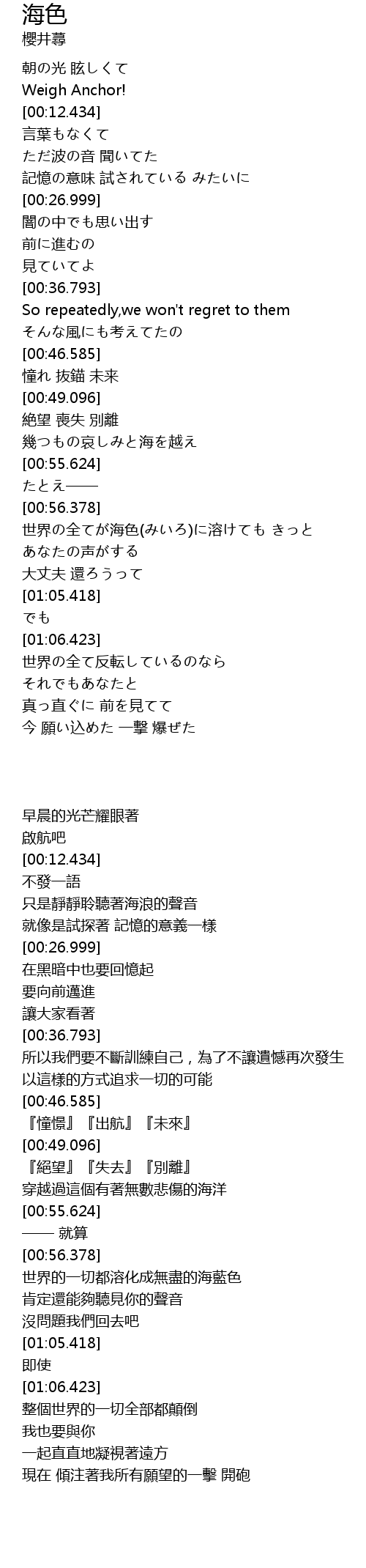 | [00:56.628] | 世界の全てが海色(みいろ)に溶けても きっと |