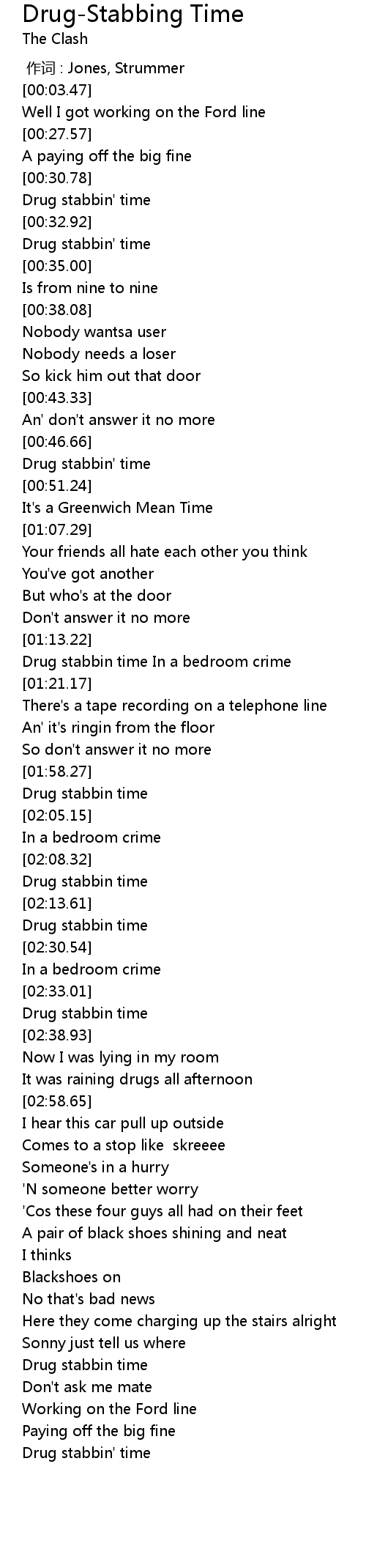 | [01:19.87] | Drug stabbin time In a bedroom crime |