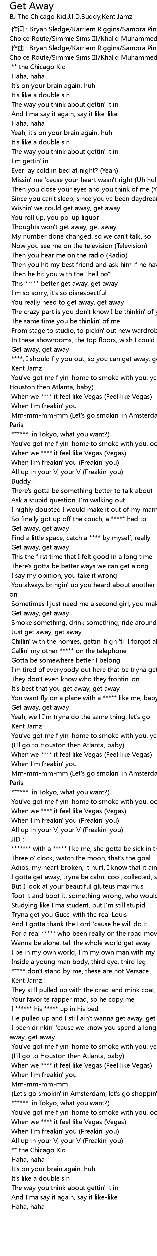 | [03:41.831] | I been drinkin' ' cause we know you spend a long time, let' s get away, get away |