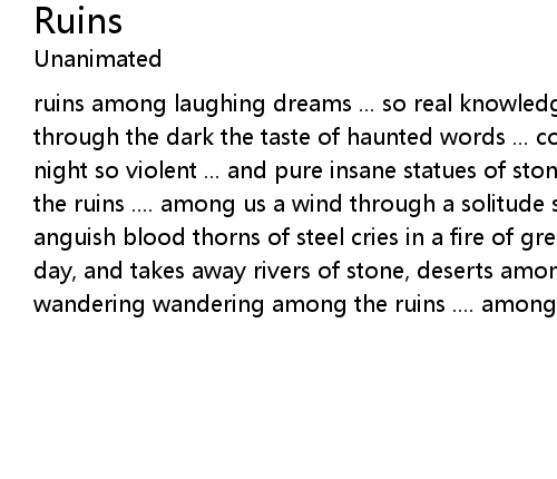 ruins among laughing dreams ... so real knowledge of a wind so old ... whispers through the dark the taste of haunted words ... comes forth and pleasures a night so violent ... and pure insane statues of stone wandering wandering among the ruins .... among us a wind through a solitude so dark it sleeps in a path of anguish blood thorns of steel cries in a fire of greed of pain it leaves the day, and takes away rivers of stone, deserts among ... me statues of of stone wandering wandering among the ruins .... among me |