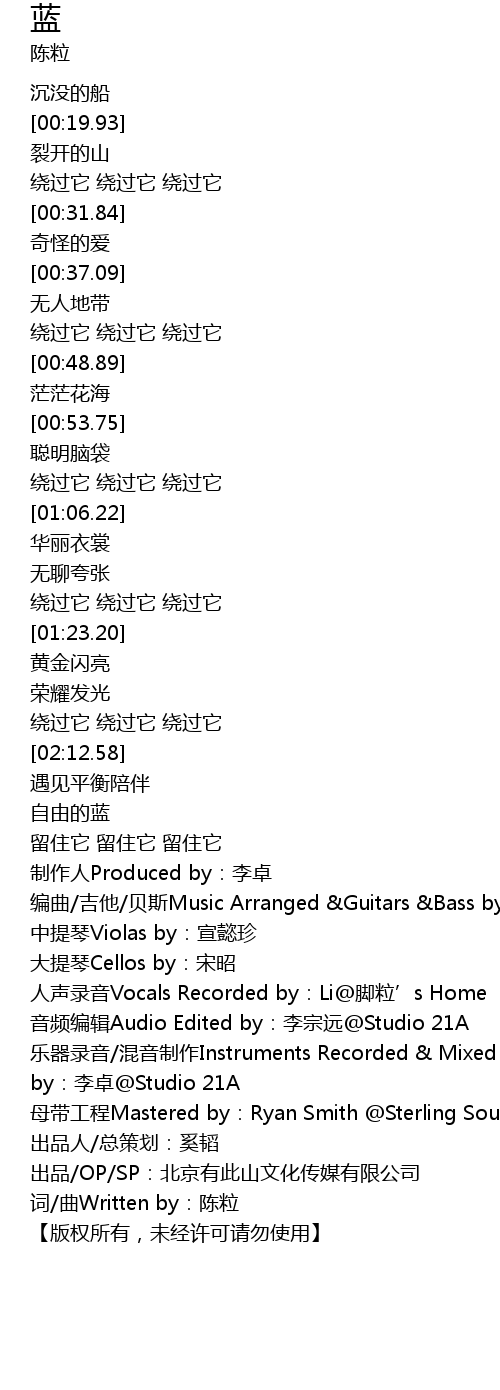 [02:34.36] yuè qì lù yīn hùn yīn zhì zuò Instruments Recorded Mixed by: lǐ zhuō Studio 21A