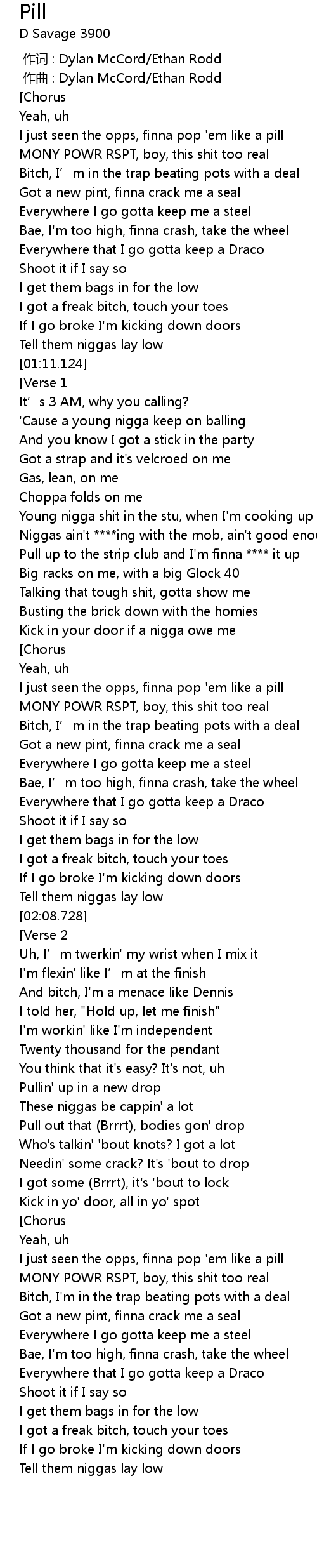 | [01:43.725] | I just seen the opps, finna pop 'em like a pill |