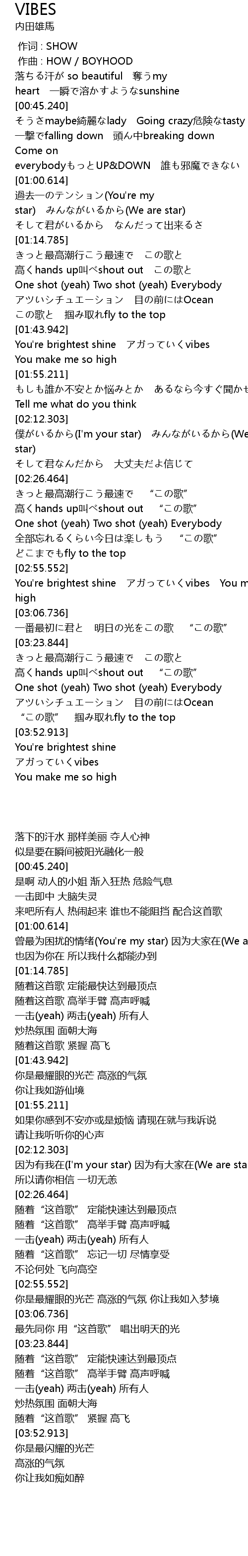 | [02:57.937] | You're brightest shine アガっていくvibes You make me so high |