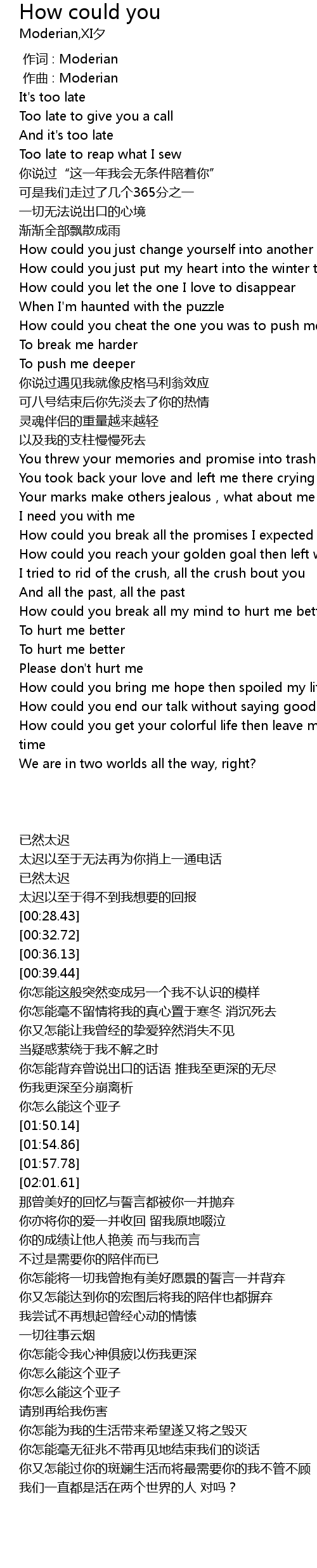 | [01:15.53] | 你怎能背弃曾说出口的话语 推我至更深的无尽 |