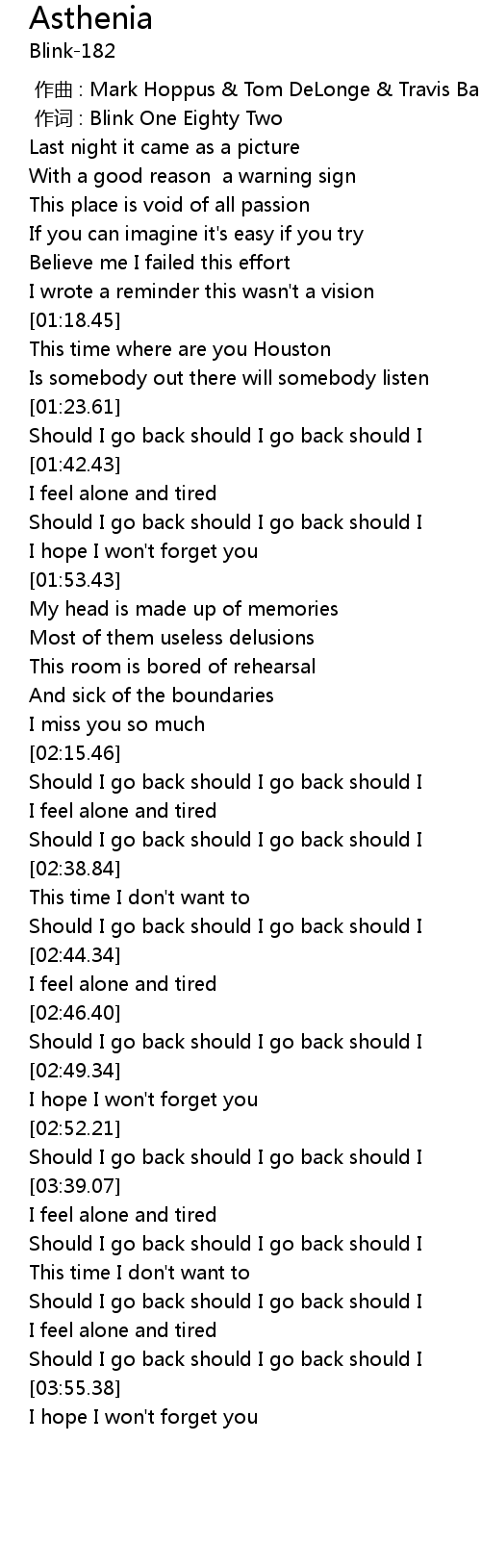 | [00:00.00] | zuo qu : Mark Hoppus Tom DeLonge Travis Barker |