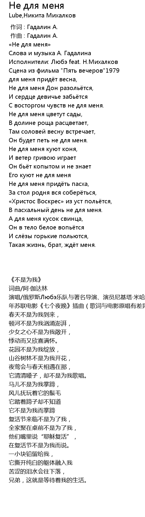 | [00:05.286] | Исполнители: Любэ feat. Н.Михалков |