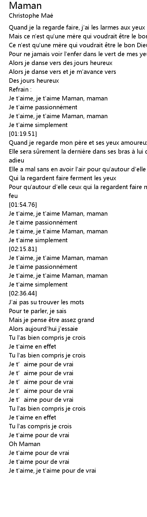 | [00:59.14] | Je t'aime, je t'aime Maman, maman |