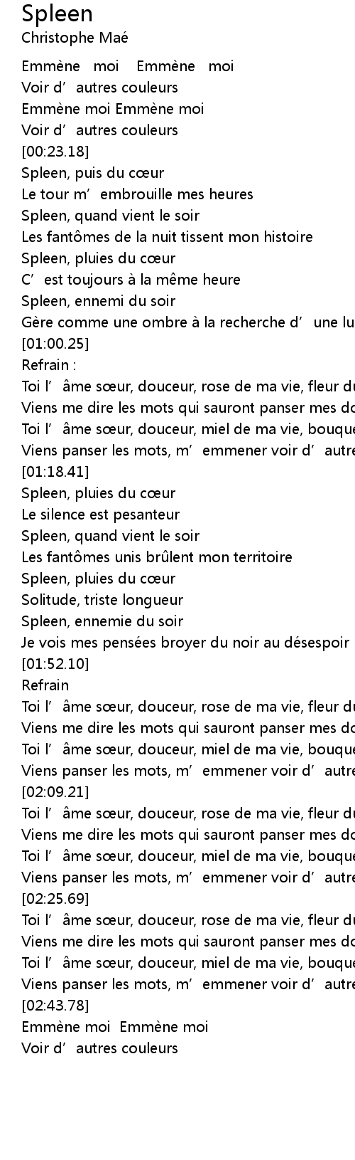 | [01:56.67] | Viens me dire les mots qui sauront panser mes douleurs |