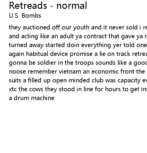 they auctioned off our youth and it never sold i remember when you were young and acting like an adult ya contract that gave ya nill morals never filld so ya turned away started doin everything yer told one track retreads doin it all over again habitual device promise a lie on track retreads again hey kid i hear yer gonna be soldier in the troops sounds like a good career ya got your neck ina noose remember vietnam an economic front the poor at war makes money for the suits a filled up open minded club was capacity everubodys snortin coke and doin xtc the cows they stood in line for hours to get inside a disco rave to freak on a drum machine
