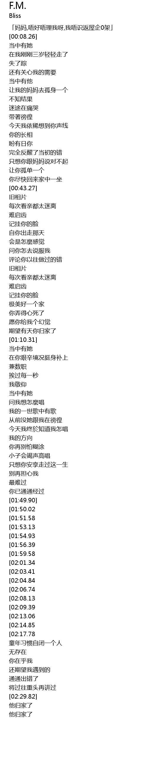 | [00:03.94] | 「妈妈,唔好唔理我呀,我唔识返屋企0架」 |