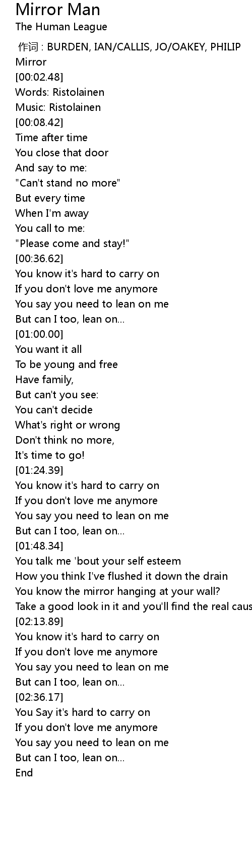 | [00:00.00] | 作词 : BURDEN, IAN/CALLIS, JO/OAKEY, PHILIP |
