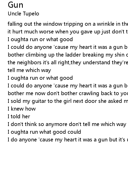 I could do anyone 'cause my heart it was a gun but it's unloaded now so don't bother climbing up the ladder breaking my shin on the very first rung waking up the neighbors it's all right,they understand they're just as dumb and they don't tell me which way |