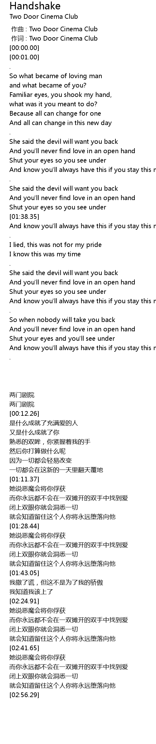 | [00:00.00] | 作词 : Two Door Cinema Club |