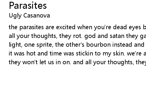 | the parasites are excited when you're dead eyes bulging, entering your head. and all your thoughts, they rot. god and satan they gamble when you're dead beams of light, one sprite, the other's bourbon instead and all your thoughts, they rot. it was hot and time was stickin to my skin. we're all a punchline to a joke that they won't let us in on. and all your thoughts, they rot. |