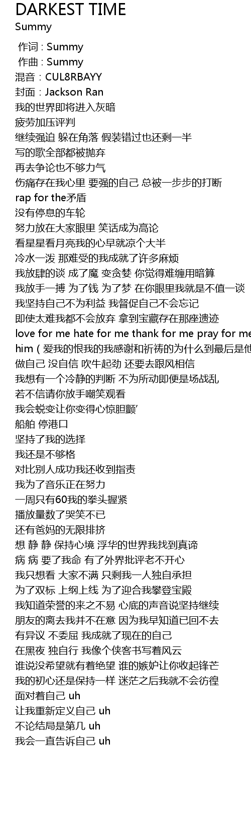 | [00:53.411] | love for me hate for me thank for me pray for me why you gonna be him ai wo de hen wo de wo gan xie he qi dao de wei shi me dao zui hou shi ta cheng gong |