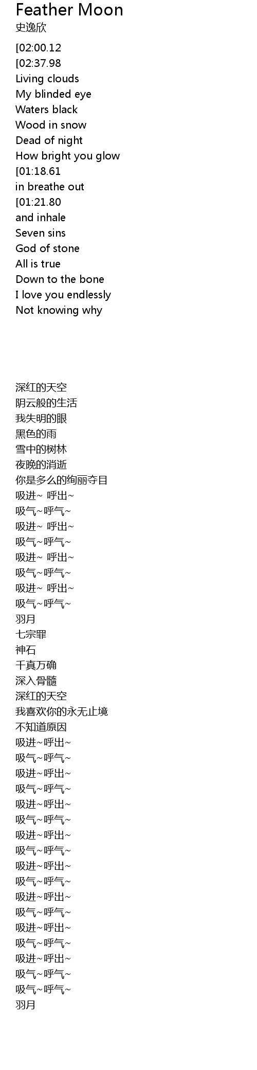 | [01:14.35][01:21.80][01:29.91][01:37.43][02:54.08][03:01.78][03:09.40][03:17.62][03:25.40][03:32.90][03:40.57][03:48.38][03:52.50] | Exhale and inhale |
