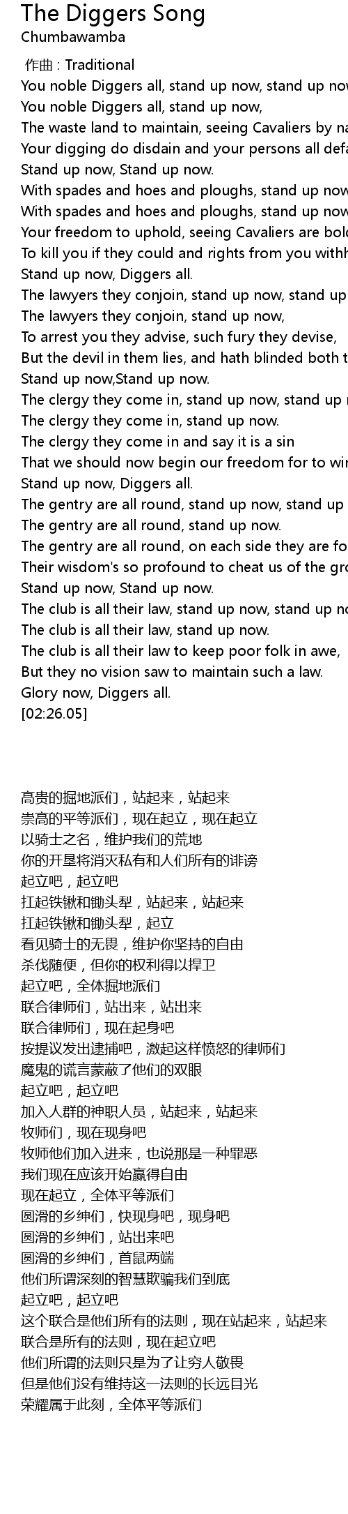 | [00:01.22] | You noble Diggers all, stand up now, stand up now, |
